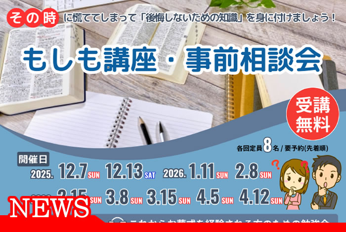 | 講 座 | 「もしも講座・事前相談会」 第一部:10時00分~11時30分 これからお葬式を経験される方のための勉強会 第二部:13時30分~15時00分 お墓についてのアレコレ勉強会▼もしも講座・個別相談会 |
