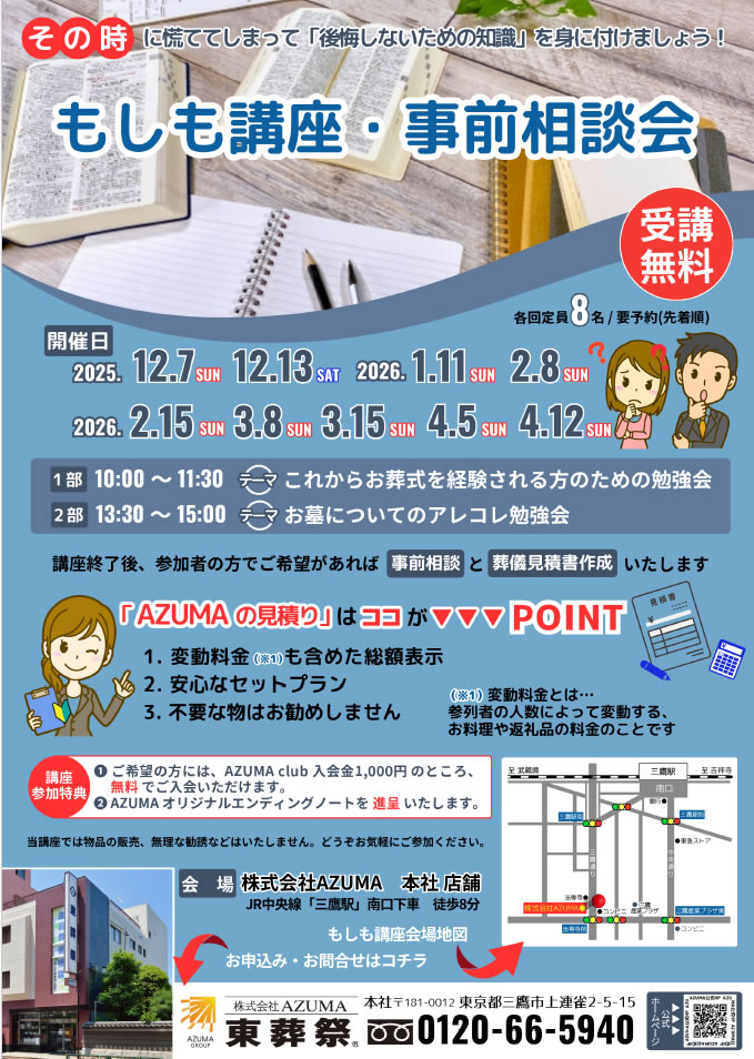 | 特 典 | ご参加いただきました皆様に特典といたしまして、 1.AZUMA club入会金1,000円のところ無料でご入会いただけます。 2.AZUMAオリジナルエンディングノートを進呈いたします。 |