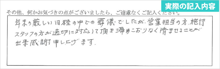 年末の厳しい日程の中での葬儀でしたが、営業担当の方、施工スタッフの方が適切に対応して頂き滞りなく済ませることが出来感謝申し上げます。