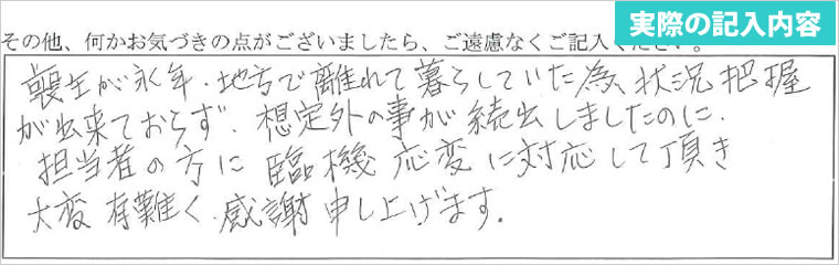 喪主が長年、地方で離れて暮らしていた為、状況把握ができておらず、想定外の事が続出しましたのに、担当者の方に臨機応変に対応して頂き大変有難く感謝申し上げます。