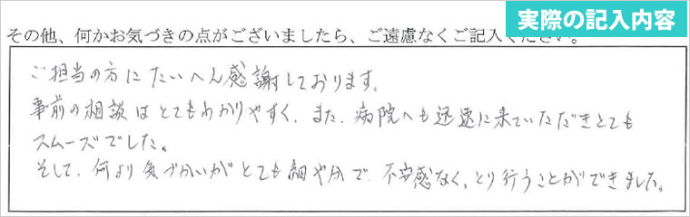 ご担当の方にたいへん感謝しております。事前の相談はとても分かりやすく、また、病院へも迅速に来ていただきとてもスムーズでした。そして、何より気づかいがとても細やかで不安感なく執り行うことができました。